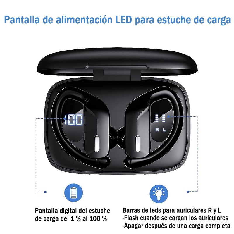 • Pantalla de alimentación LED para estuche de carga. Estuche de carga de audífonos bluetooth deportivos con LED de alimentación. La pantalla muestra la energía restante en porcentaje. El estuche de carga presenta su batería del 1% al 100%. Para los audífonos inalámbricos verdaderos derecho o izquierdo, mientras el auricular se está cargando, las barras LED del auricular parpadearán, una vez que el auricular esté completamente cargado, las barras LED del auricular no parpadearán.