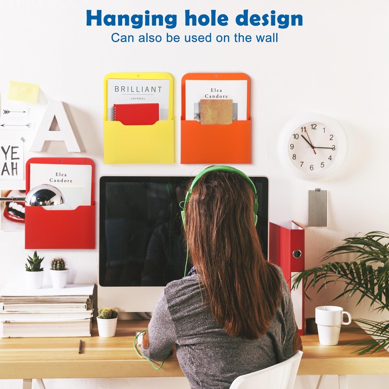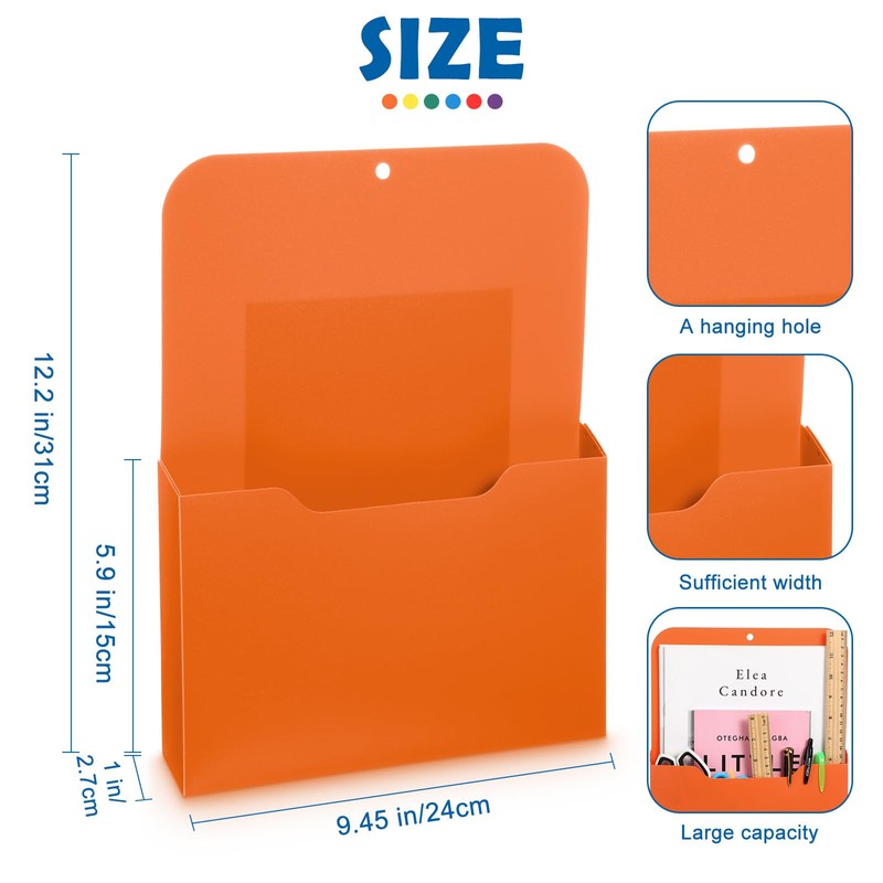 The magnetic file organizer has a smart large opening design, making it easy for you to insert and remove files. It also has a hole for wall attachment, offering you further versatility in usageOur wall pocket file holder can keep important papers and documents right within your reach, bringing much convenience to your life, you can also share it with friends. Specifications: Material: PP plastic and magnet on the back Color: red, purple, blue, green, yellow, orangeSize: approx. 12.2 x 9.45 x 1.06 inches/ 31 x 24 x 2.7 cmPackage includes: 6 x Wall hanging file organizerNotes: Manual measurement, please allow slight errors on size. The color may exist a slight difference due to different screen displays.