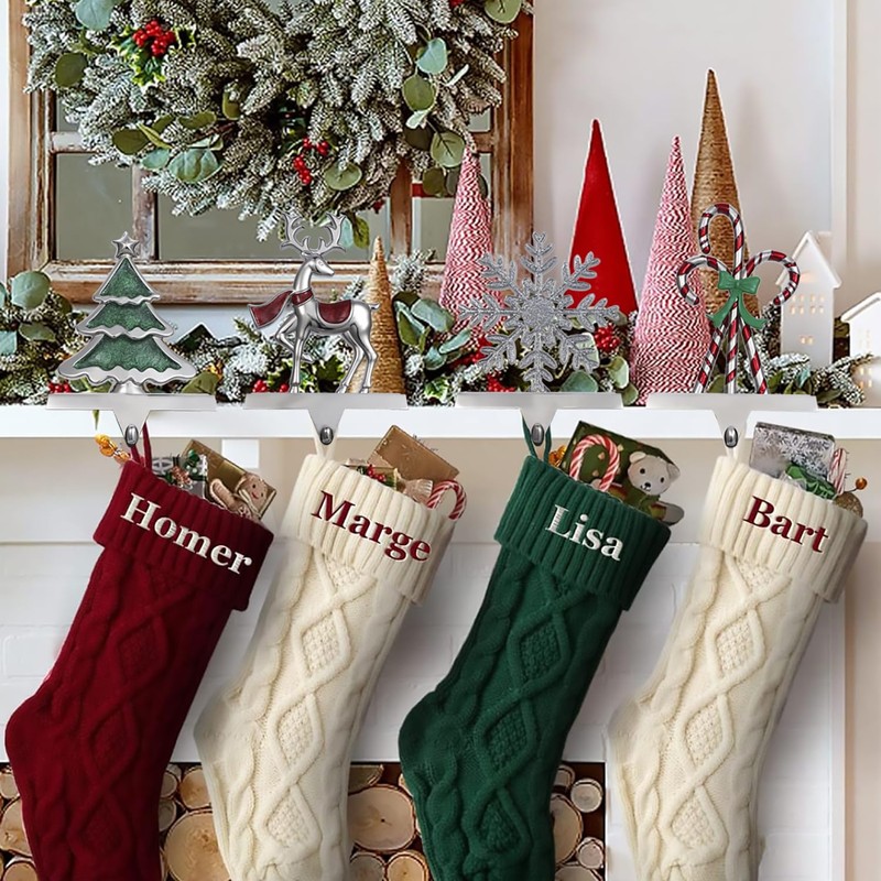 The colorful Christmas stocking holders on the mantel. Free Standing Mantel Hanger perfectly blends with most home decorations and holiday decorations.