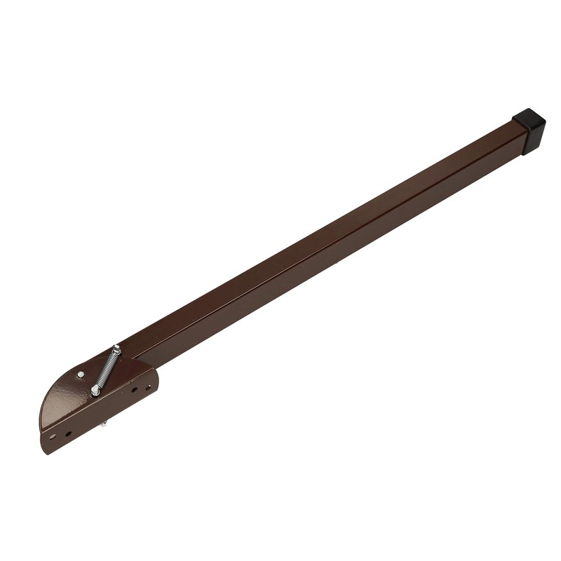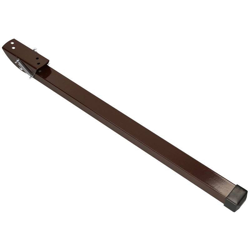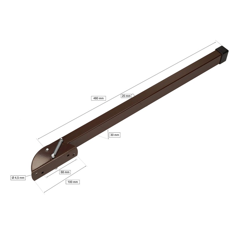 - Technical data: brown door stop, length: 480 mm, width: 30 mm, depth: 20 mm, length of mounting plate: 100 mm, distance mounting plate: 68 mm, diameter mounting holes: 4.5 mm, material: steel, coating: powder-coated, colour: brown, rubber foot, weight: 430 g
