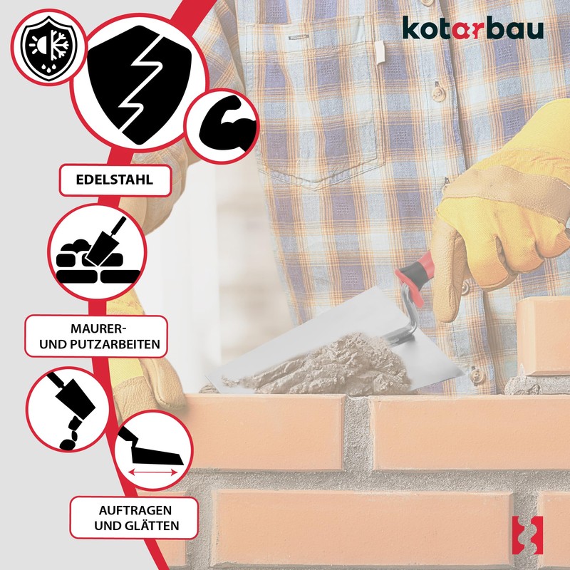 - The sanded blade prevents the slipping of mortar, ensures resistance and is additionally welded to the handle, which makes the Kotarbau trowel robust and durable. The use of high-quality, corrosion-resistant sheet steel ensures excellent durability of the product.