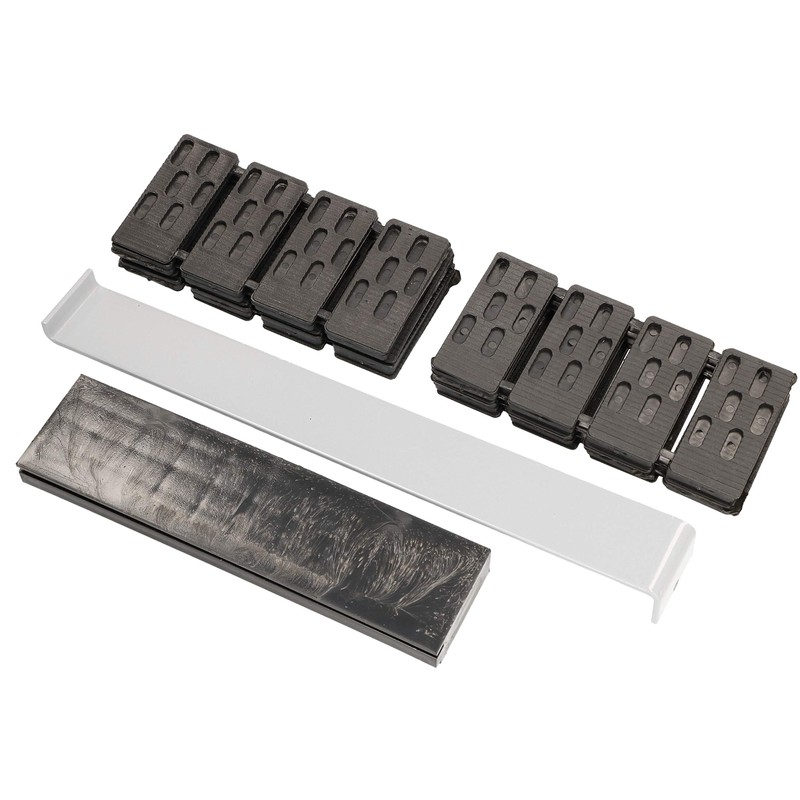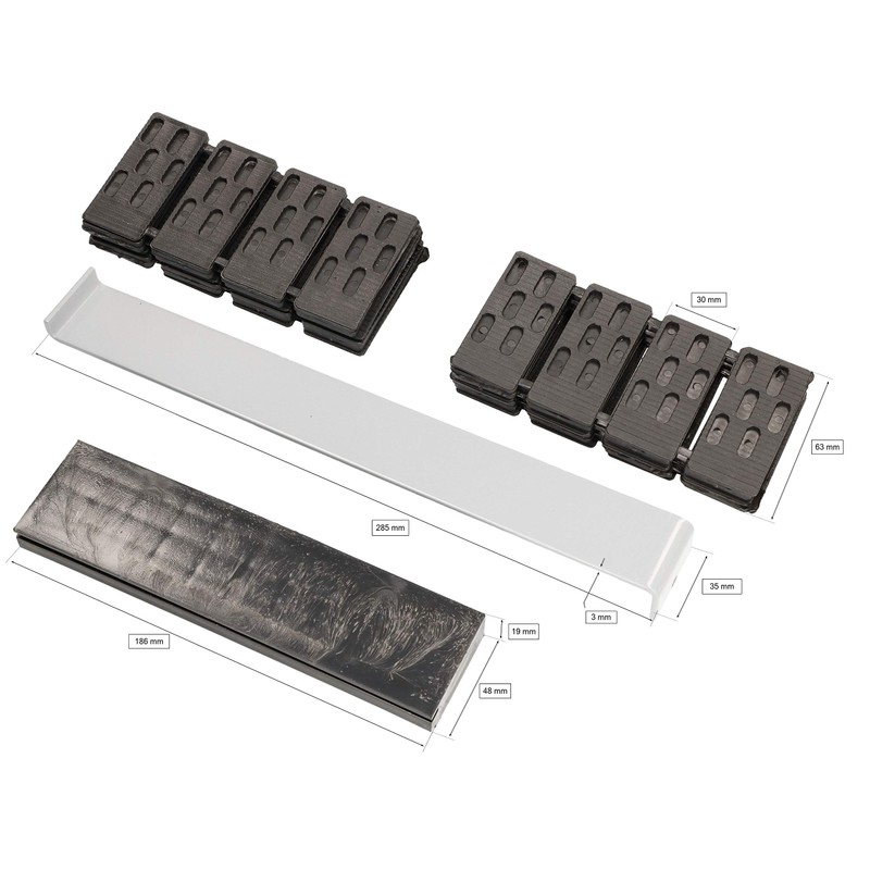 - Technical data – Installation kit – 40 spacer wedges – Length of strike block: 186 mm, width of strike block: 48 mm, thickness of strike block: 19 mm, length of pull rod: 285 mm, width of pull rod: 35 mm, thickness of pull bar: 3 mm, length spacer: 63 mm, width spacer: 30 mm, thickness Distance holder: 1. distance hol3 mm, weight: 556 g, material: metal, plastic
