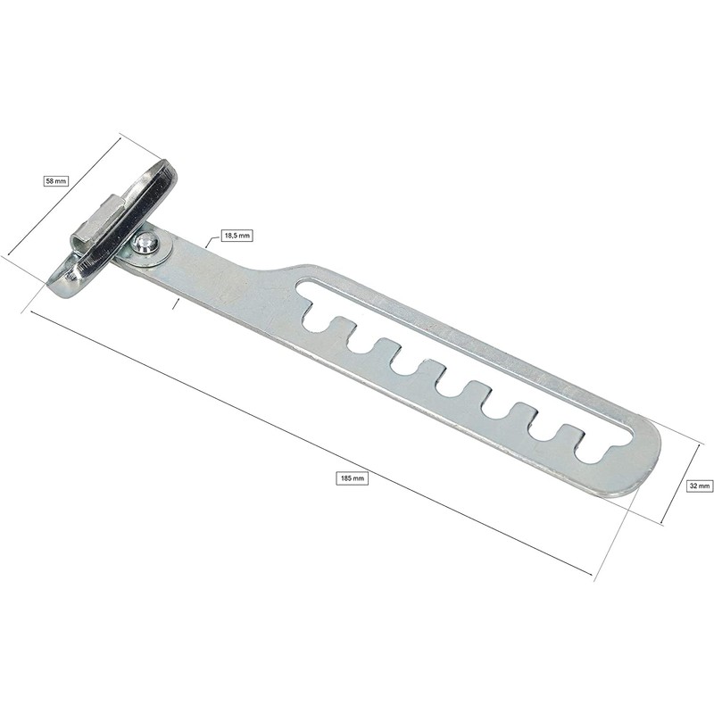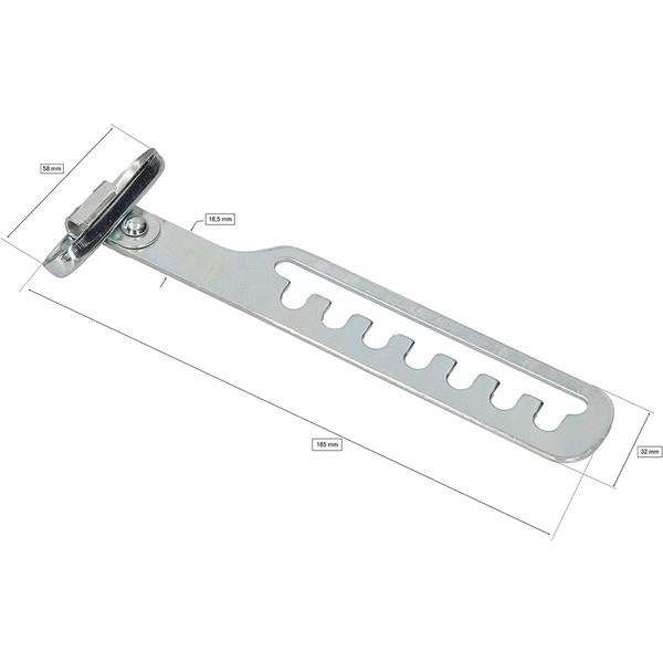 - SPECIFICATIONS - Window latch 19 cm galvanised silver - Total length of arm: 185 mm, width of arm: 32 mm, width of mounting plate: 58 mm, weight: 94 g, material: steel, coating: zinc plating, colour: silver