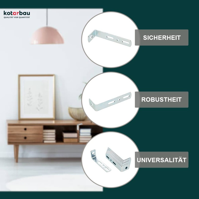 - Safety - The wooden connector with a very high load capacity (depending on size), is made of precise steel and is also very resilient and helpful when installed correctly. Thanks to its well-thought-out construction, the angle connector is safe and reliable. Perfect for hanging kitchen furniture and bathroom furniture.