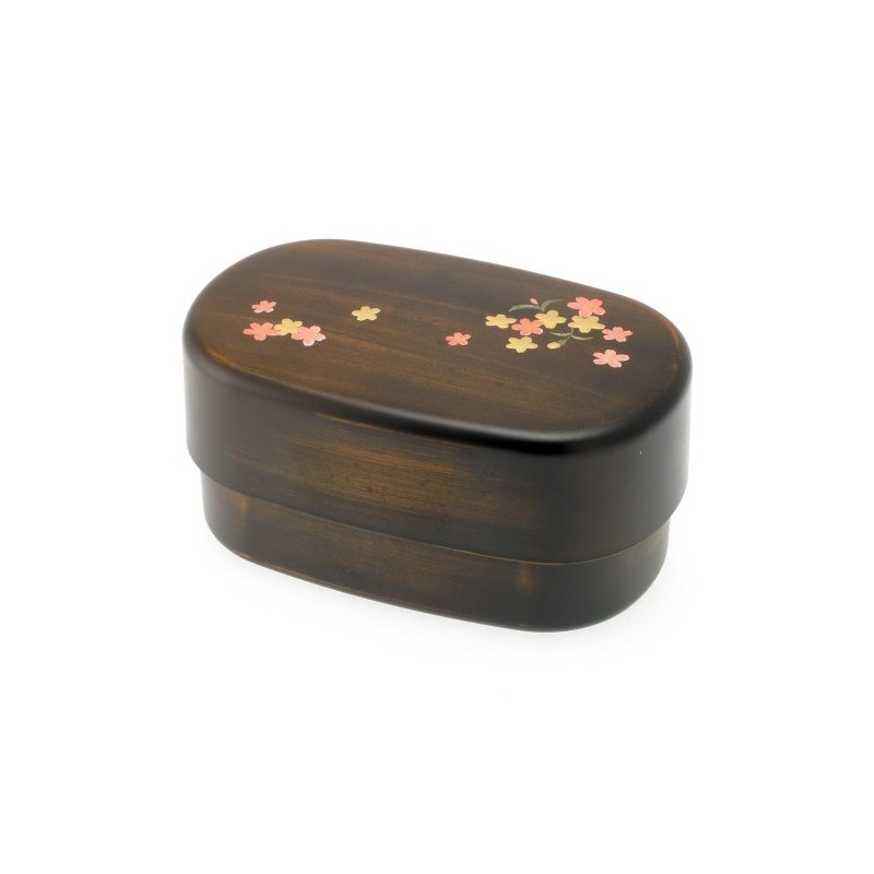 - Two-tiered bento box with black body and red woodgrained top, decorated by pink and white cherry blossoms