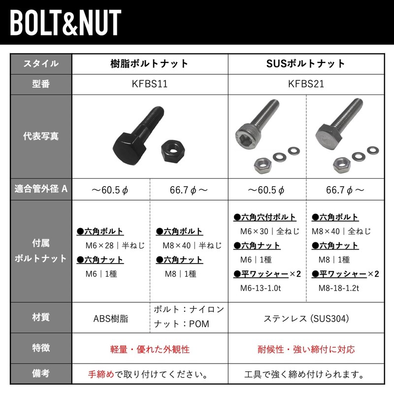Resin bolt nut: (M6 x 28), ABS (M8 x 40), Nylon/POM