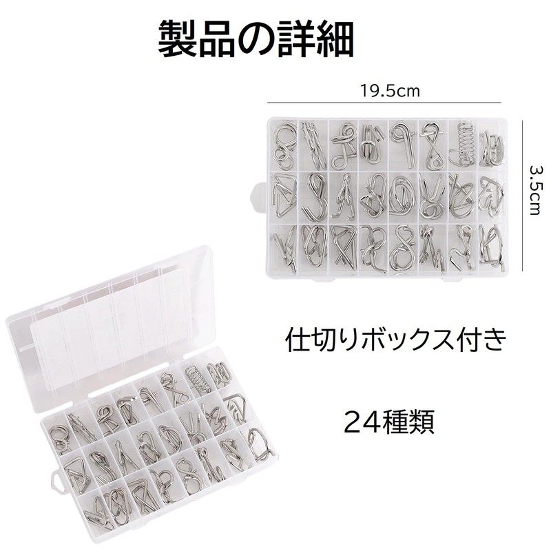 - Product Specifications: Material: Stainless steel. Set includes: 24 pieces of brain teaser, 1 x storage case. Case size: 19.5*13.5*3.5cm Ages 5+ Comes with a storage case, so you can carry it in a compact manner without worrying about a mess