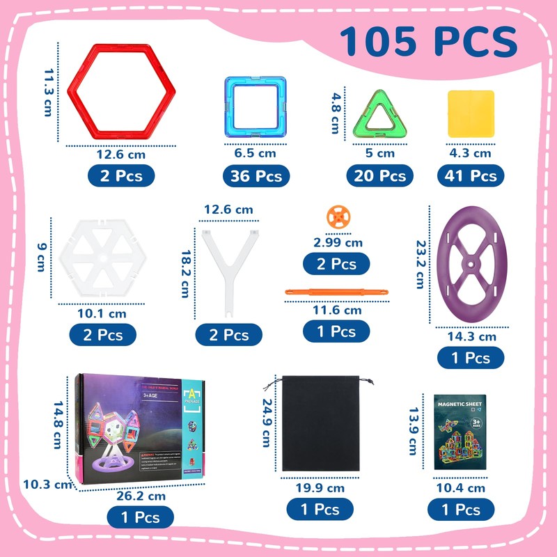 - Compact 105-Piece Kit for Travel - Includes 36 squares, 20 triangles, 8 ferris wheel accessories, and 41 decorative panels. This set is easy to carry and store in the included fabric bag, making it perfect for keeping kids entertained during trips or playdates.