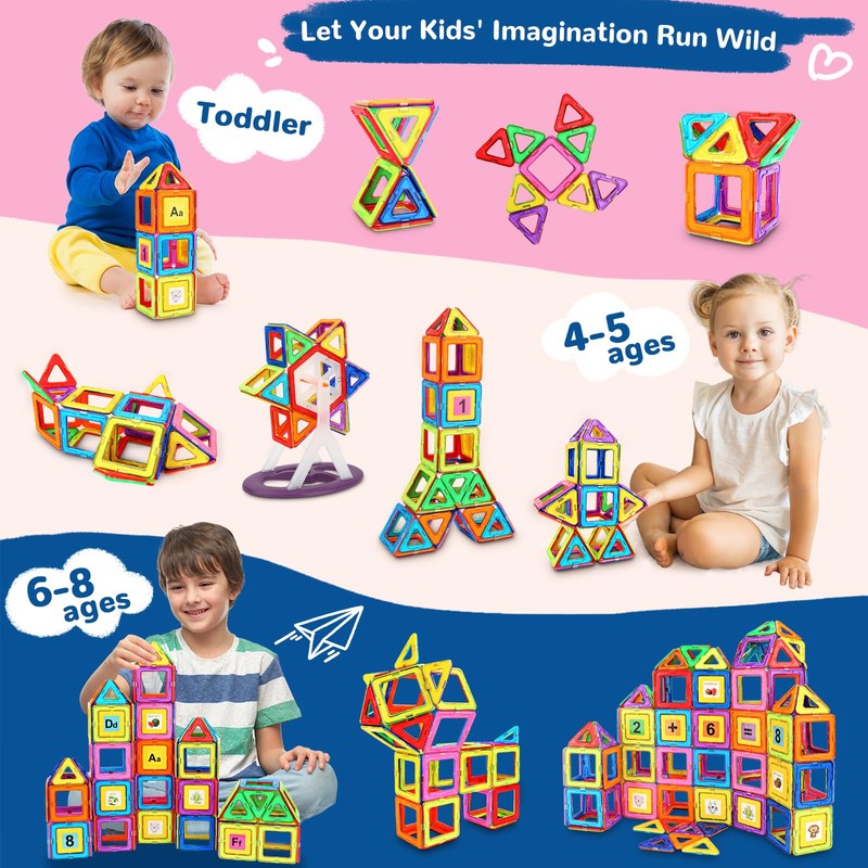 - Build Amazing 3D Models with Magnetic Tiles - This set includes various shapes of magnetic building blocks, such as squares and triangles. Kids can use these magnetic tiles to build castles, animals, pentagrams, airplanes, and more. Perfect for creating both 2D and 3D structures.
