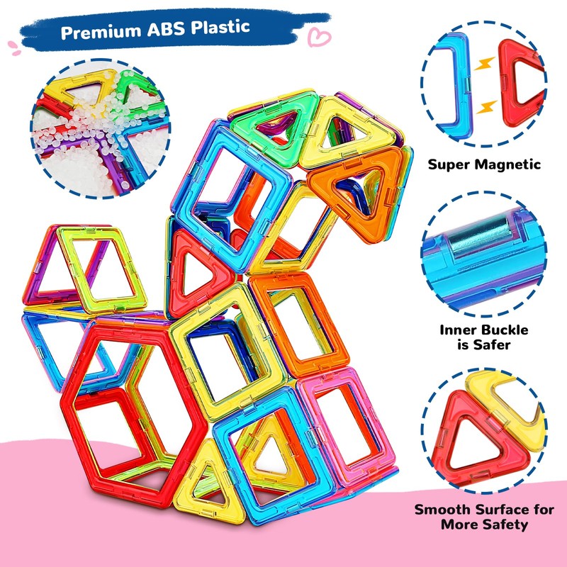 - Safe and Durable Magnetic Building Blocks - CE Certified and made from non-toxic, durable ABS plastic and food-grade materials. These magnetic blocks feature rounded edges, ensuring safety and preventing sharp parts that could hurt small hands.