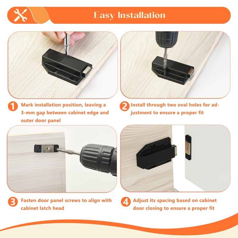 • Easy Installation - It only takes a few minutes to install the oval holes for the closing position and then screw in the cabinet door stopper.