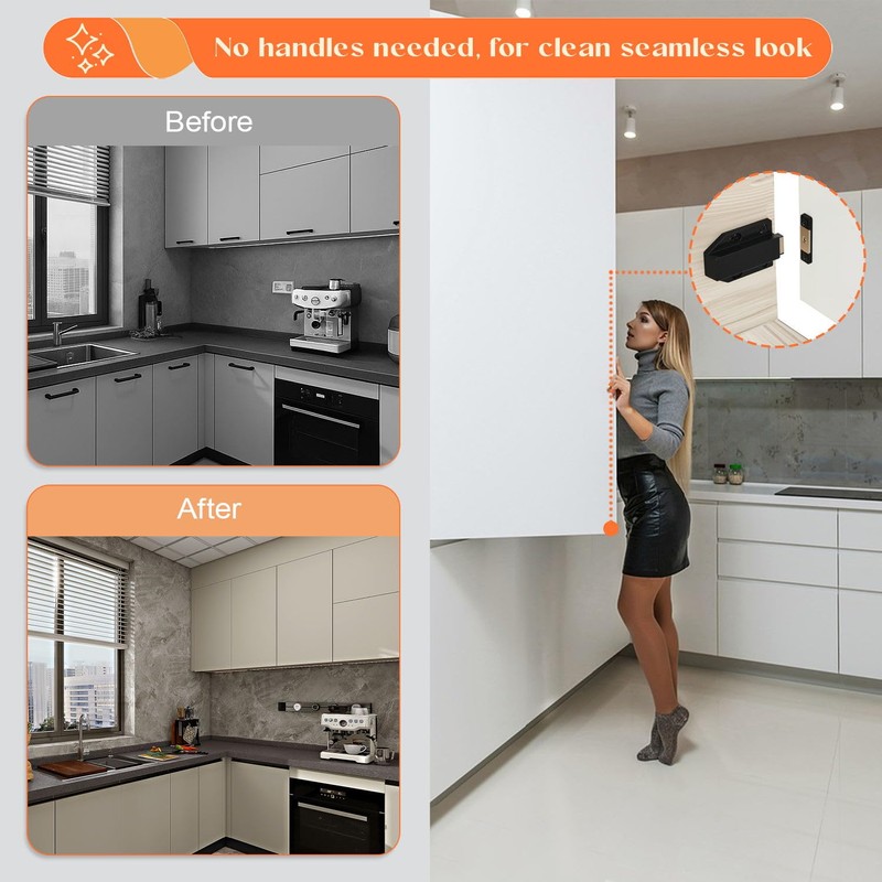 • Push to Open Design - With a built - in spring - loaded plunger, simply press the door to latch or unlatch. No handles or knobs needed, for a clean, seamless look.