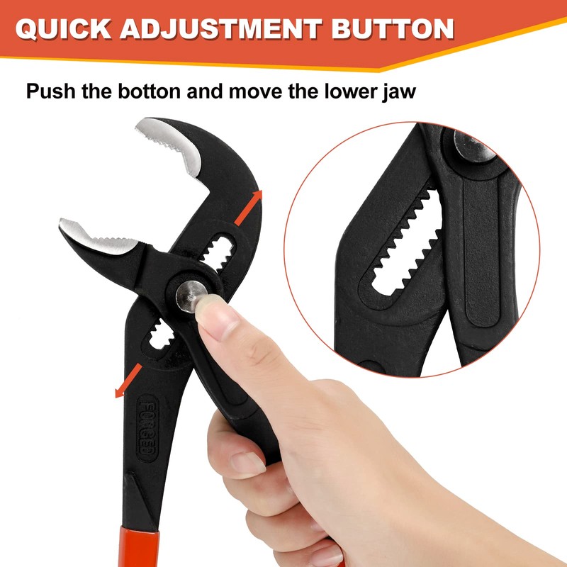 - Spring-loaded push-button design allows for fast and easy adjustments, Just push the button and adjust the lower jaw. Faster than traditional groove joint pliers.