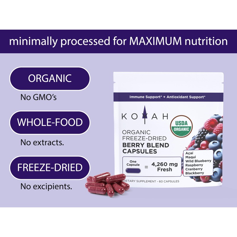 KOYAH Organic Berry Blend Capsules – 600 mg (Concentrated 7.1x Through Freeze-Drying) Natural Antioxidants & Polyphenols - Vegan, Non-GMO, Allergen-Free, Gluten-Free, 100% Whole-Berry - 60 Capsules