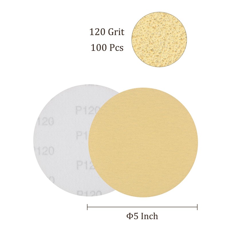Kozelo 100pcs No Hole Sanding Discs- [ 5 Inch 120 Grit ] Round Hook and Loop Grip Sanding Pads Sheet Sandpaper for Automotive Woodworking Metal Polishing Use| Gold, Aluminum Oxide