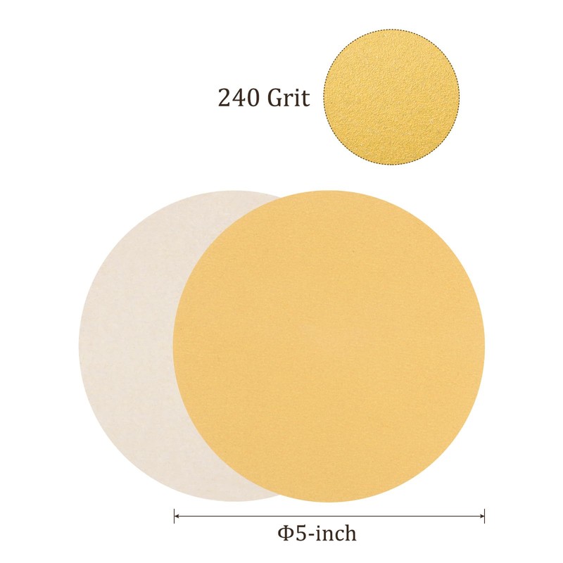 Kozelo 100pcs PSA Sanding Discs - [5 Inch x 240 Grit] No Hole C-Weight Self Adhesive Sticky-Back Sandpaper for Automotive Car Paint Woodworking Metal Finishing Use, Aluminum Oxide, Round