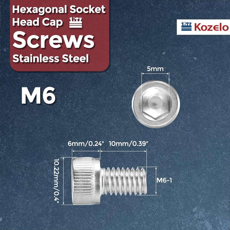 - 1- PACKAGE CONTENTS - 10pcs of hex head socket head cap screws, Thread Size: M6-1; Thread Length: 10mm/0.39"; Head Diameter: 10.22mm/0.4"; Head Thickness: 6mm/0.24"; Hexagon Width: 5mm; They are a versatile and reliable choice for a wide range of industrial and commercial applications.