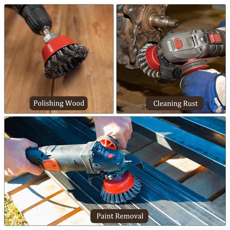 - 3- APPLICATION - The Wire Cup Brush is specially designed for use with angle grinders or power tools and is used in metal processing, decoration, construction and manufacturing industries to perform multi-angle rust removal, paint removal, deburring, paint removal, dirt cleaning, and polishing.