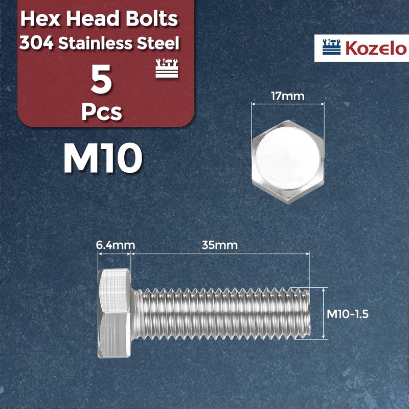 Kozelo 5 Pcs Hex Head Screws Bolts - [M10-1.5x35] 304 Stainless Grade A2-70 Steel Fully Threaded Hex Tap Metric Hexagon Head Machine Bolts Right Hand External Hex Drive, Silver