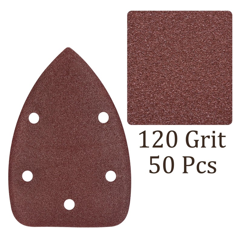 Kozelo 50pcs Mouse Sander Detail Sandpaper - [120 Grit, 3.5" x 5.5"] Triangle Hook and Loop Assorted Sanding Pads Sheet for Wood Furniture Polishing Use | 5 Hole, Aluminum Oxide