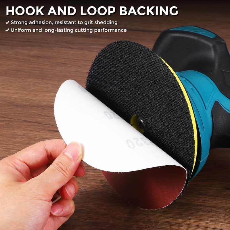 - 4 - Hook and loop backing: The hook and loop design on the back of the sanding disc ensures a firm fixation on the sanding pad and is not easy to fall off during the sanding process, allowing for quick installation or replacement of sandpaper of different mesh sizes.