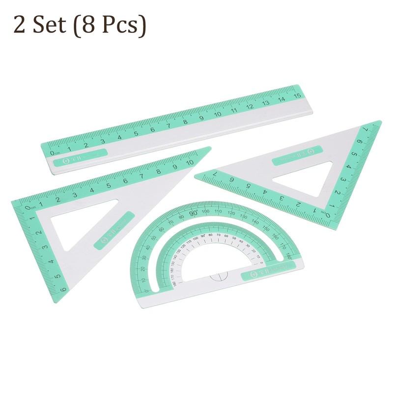 Package Content: 2 x 15cm Flat Ruler;2 x 10 cm Triangle;2 x 7cm Triangle;2 x 180-degree protractor.