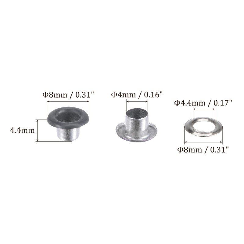 - 1- Package Contents - 200set grommets kit with 4mm / 0.16" eyelet inner dia and 8mm / 0.31" eyelet outside dia.