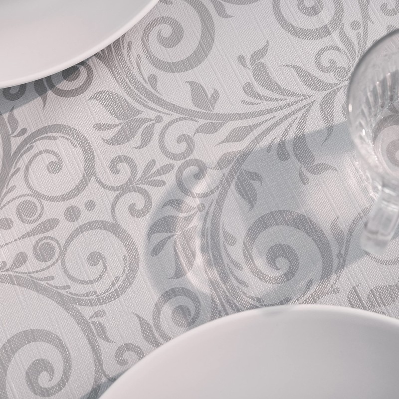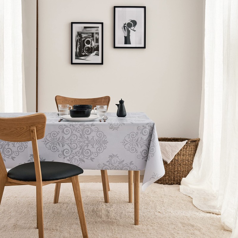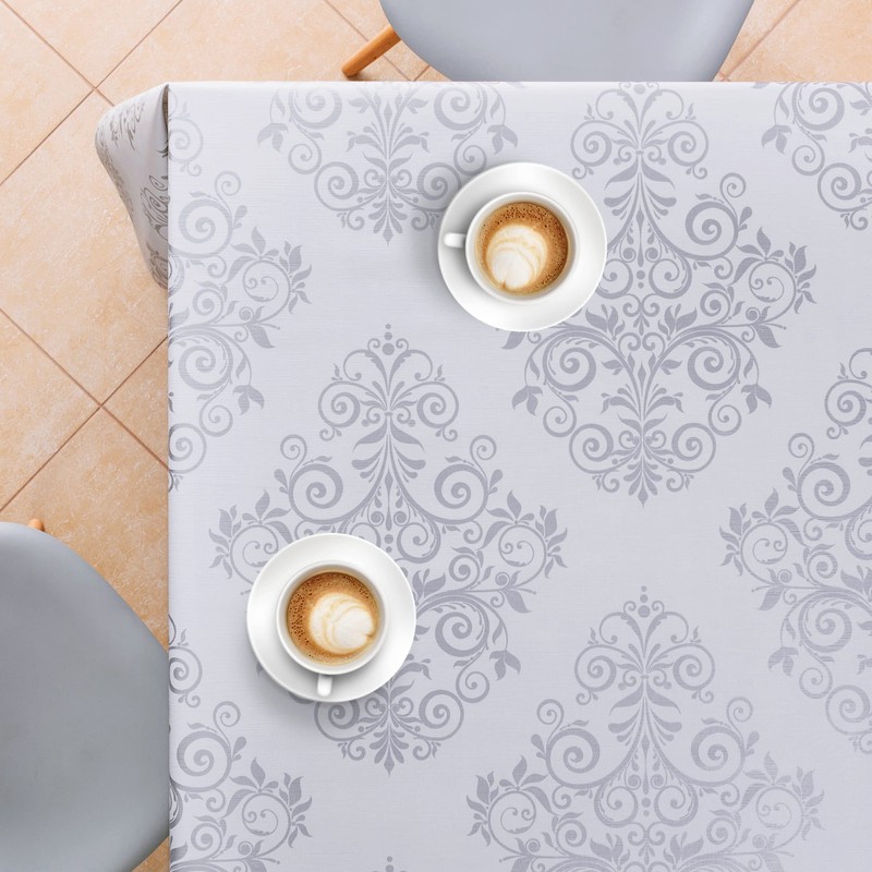 - Luxury silver grey oriental damask design PVC tablecloth for home or business office - premium grade wipe clean table cloth with the embossed textile appearance of fabric material - will look awesome on your table
