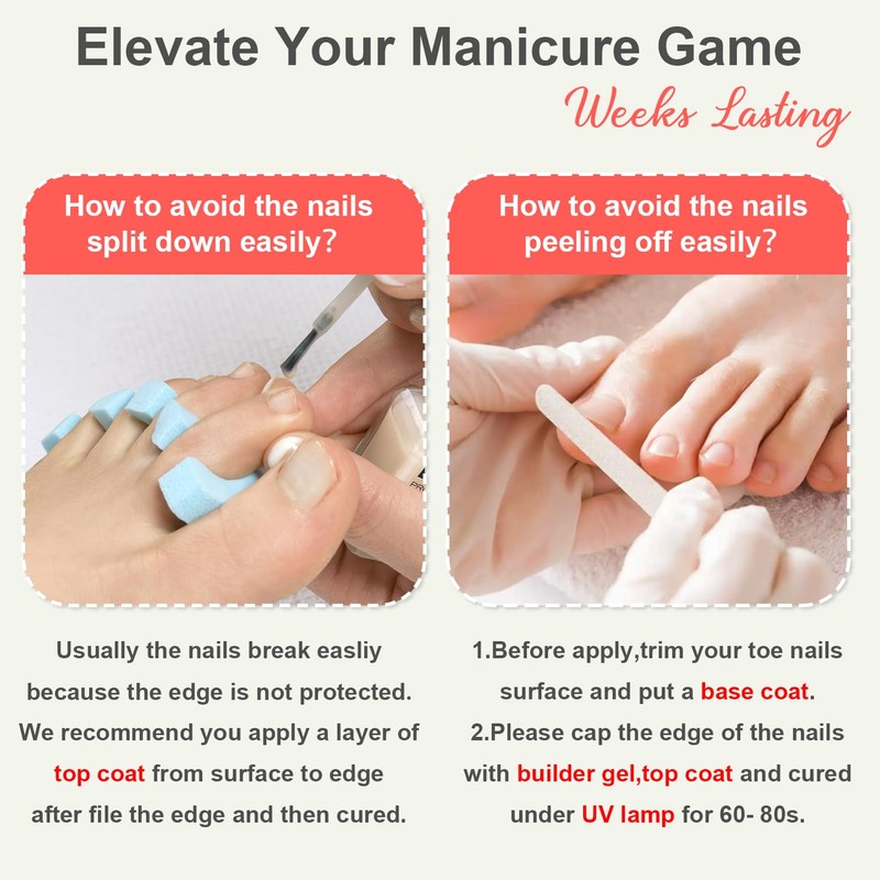 - Seamless Fit,Natural As Yours: Our press on toes are wore comfortably as they are designed based on the shape of the toenails.Toe nail glue on is a good choice for those who want to get salon-like toenails but not having time