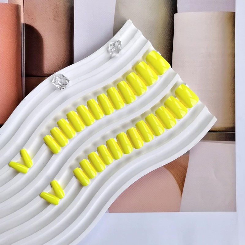 - Short Coffin Nails Press ons in Minutes: Skip the salon without compromising on quality. KQueenest easy-to-apply press on yellow nails short coffin give you a salon-fresh finish in minutes, saving you time while delivering a clean, polished appearance that lasts