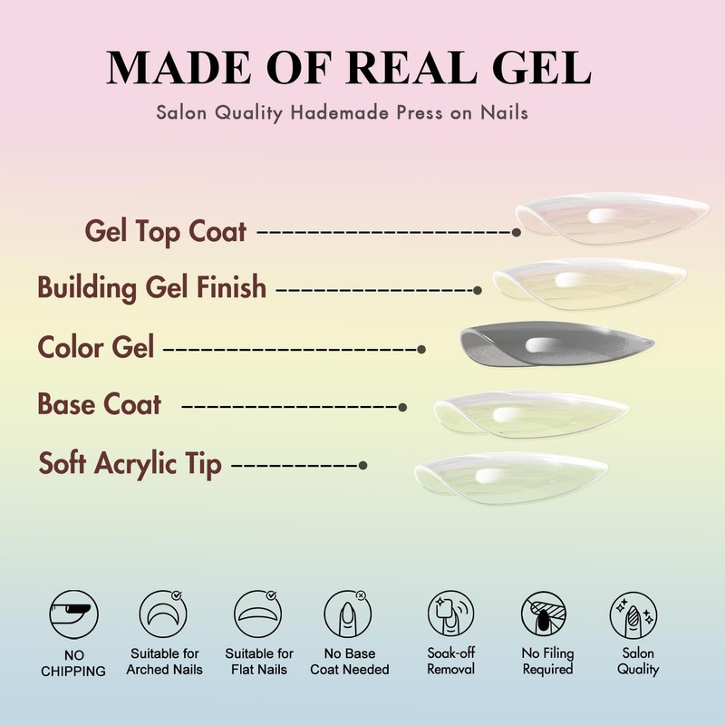 - Made of Gel: KQueenest handmade acrylic press on nails kit offer high-quality salon style and feature protective UV coating, which will never break or split. Gel nails press on will not budged a bit and still feel as great intact as they did on day one