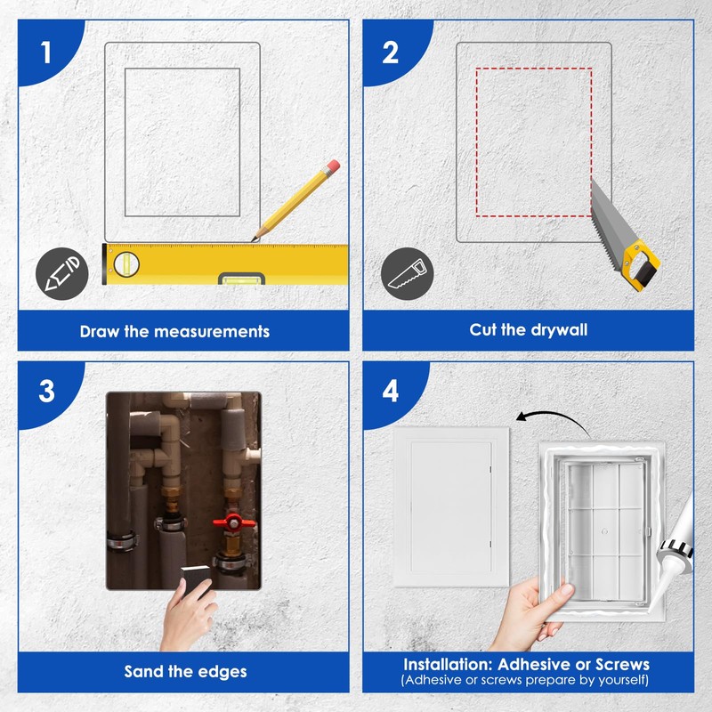 - DIY-Friendly Installation: Installing drywall access panels is a quick, convenient DIY job, easy to handle. The all-in-one design eliminates the need for additional framing, just measure the outline, cut the drywall, and secure the panel with adhesive or screws (not included). No special tools or skills required!