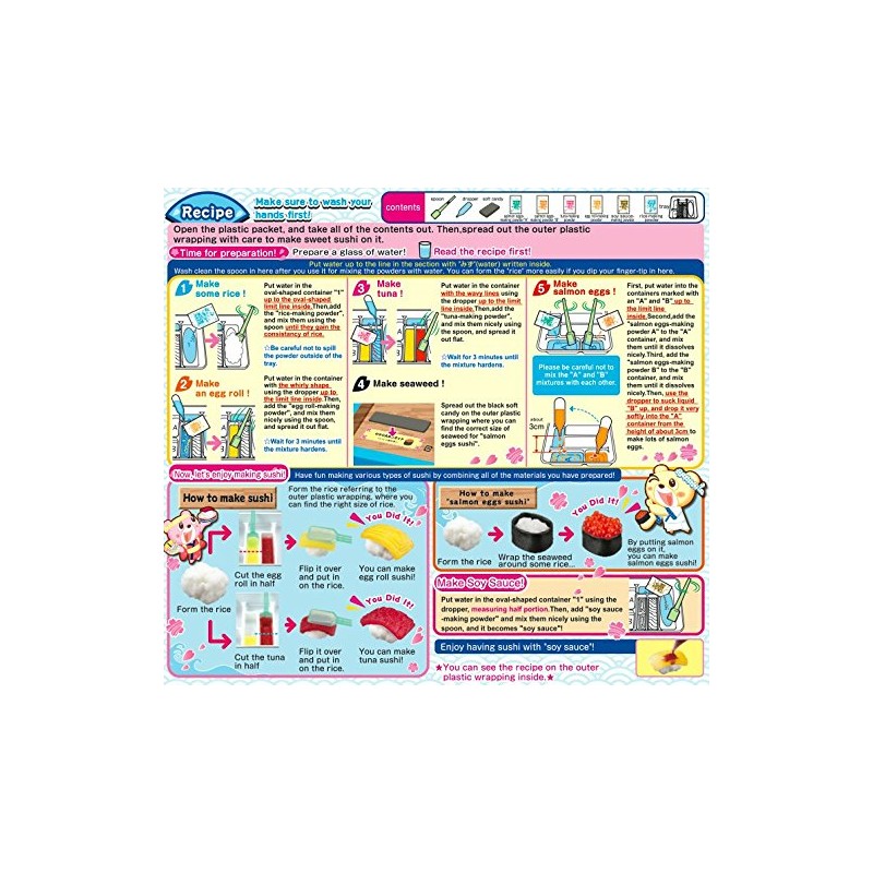 - content: 6x bags of powder with different candy ingredients, 1x spoon, 1x pipette, 1x candy material for seaweed