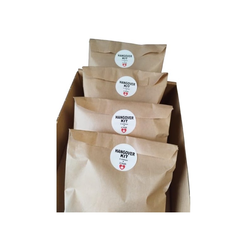 Kraft Paper Bags with Adhesive Labels for Anti-Hangover Kit, 50 Units, 22 x 16.5 cm (English)