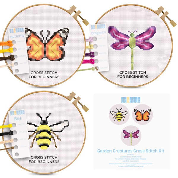 Kraftex Floral Stamped Cross Stitch Kits for Beginners - 3 Pack. DIY Embroidery Needlepoint Patterns for Adults and Kids. Easy Cross Stitch Kits for Beginners (Gardne Creatures)