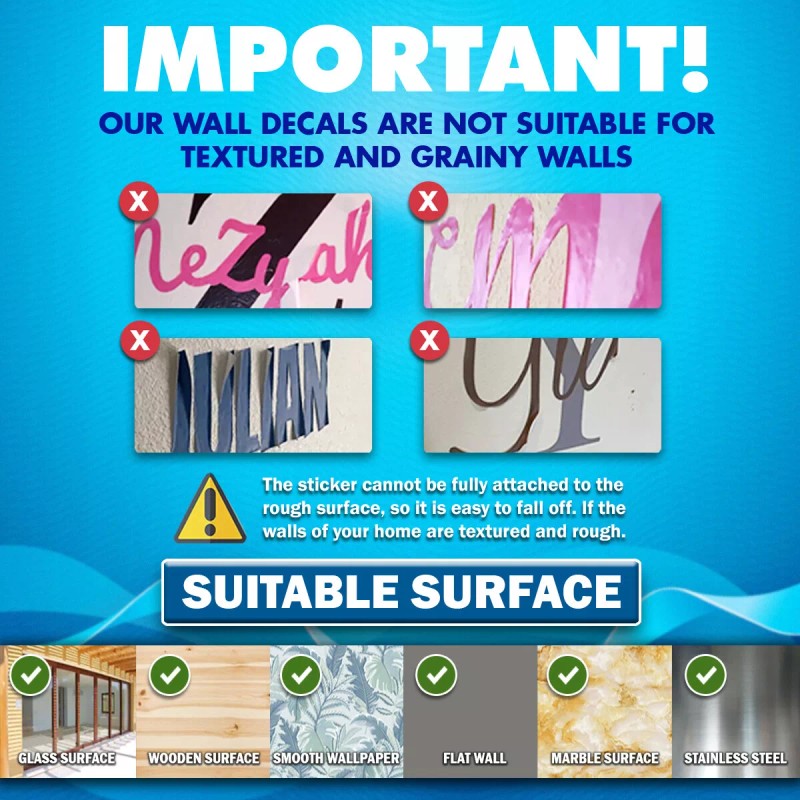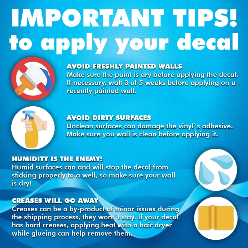• Before applying the Wall Decal, ensure the wall is free from dust, oil, or other stains. Do not apply on newly painted walls, let them dry for at least 4 weeks.