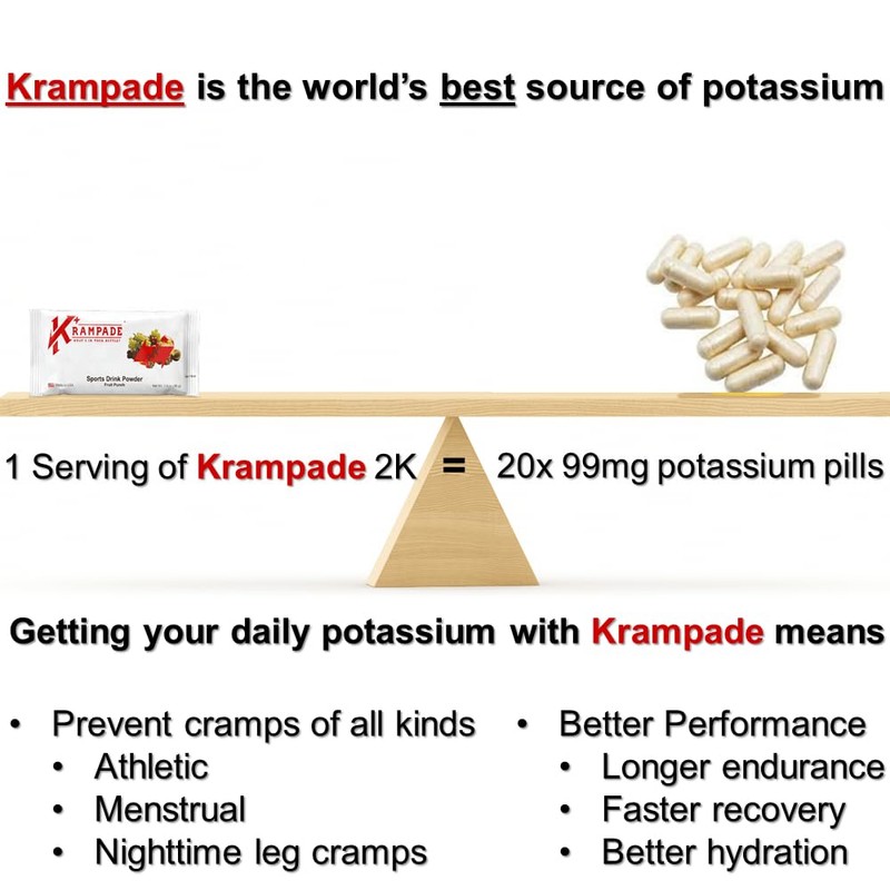 - Complete Cramp Defense - Krampade's proprietary potassium chloride and potassium citrate powder is the faster, more effective alternative to quinine for leg cramps, heating pad for period cramps, and other so-called solutions. If it cramps, we uncramp it, guaranteed.