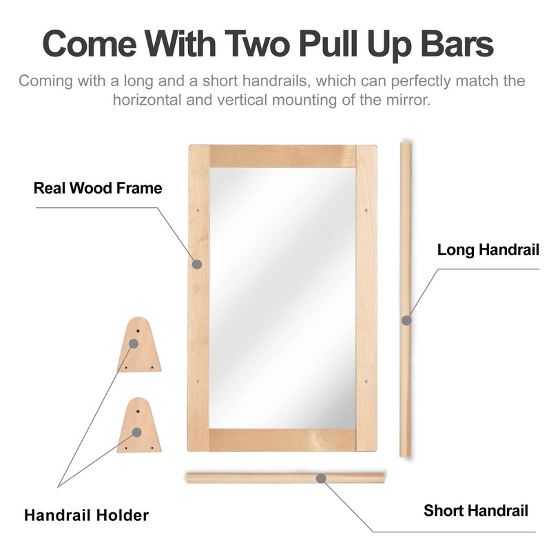 - Crafted By Premium material : Made from solid birch frame and shatterproof safety acrylic mirrors and two stable pull-up bars, which adapt well to both horizontal and vertical wall mounting positions.