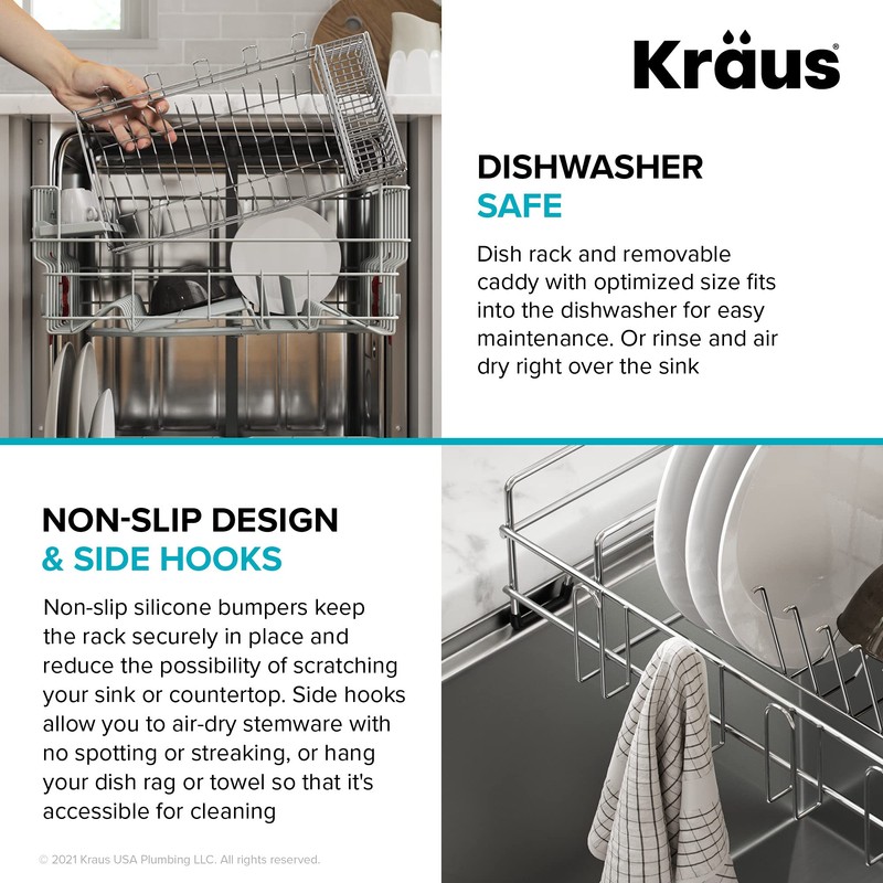 - FASTER DRYING: Open-grid design increases airflow so that wet items dry more quickly and efficiently – SIDE HOOKS provide a convenient way to air-dry stemware without spotting or streaking, as well as a place to hang your kitchen towel or dish rag so that it is easily accessible for cleaning – VERSATILE DESIGN easily slides from side to side when you need to use your kitchen faucet – COMPATIBLE WITH KRAUS WORKSTATIONS including Kore Stainless Steel Sinks, Bellucci Granite Composite Sinks, and Turino Fireclay Sink Series