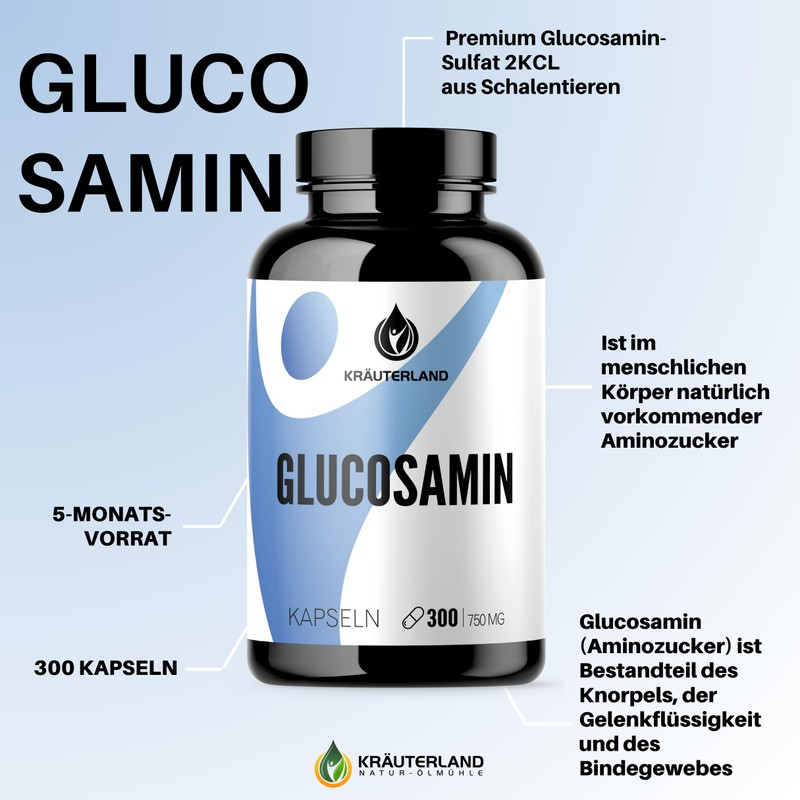 Kräuterland Glucosamine Capsules - 300 Capsules, High Dose 750 mg each, Daily Dose 1500 mg - 100% Pure Glucosamine Sulphate Powder in Premium Quality