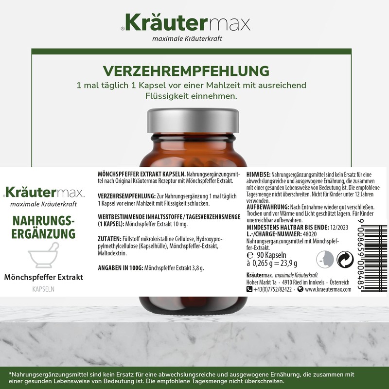 Kräutermax Monk's Pepper Capsules | Agnus Castus Extract | Monk's Pepper Capsules High Dose and Vegan according to Kräutermax Manier | Premium Quality Agnus Castus Monk Pepper | 1 x 90 Pieces