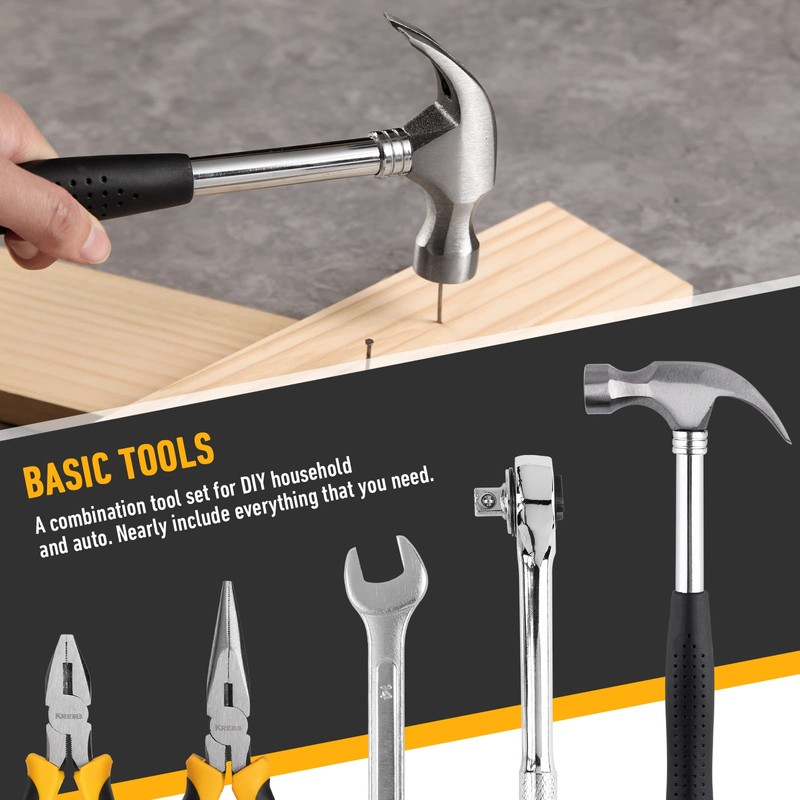- 【COMPLETE VARIETIES】-KREBS 168 pcs tool kit Rich accessories include all the commonly used tools, Metric Tape Measure, Pliers, Mini Hand Saw, Claw Hammer, Utility Knife, Supporting Metal Adaptor, Screwdriver kits and Wrench kits,etc. for home and workshop.