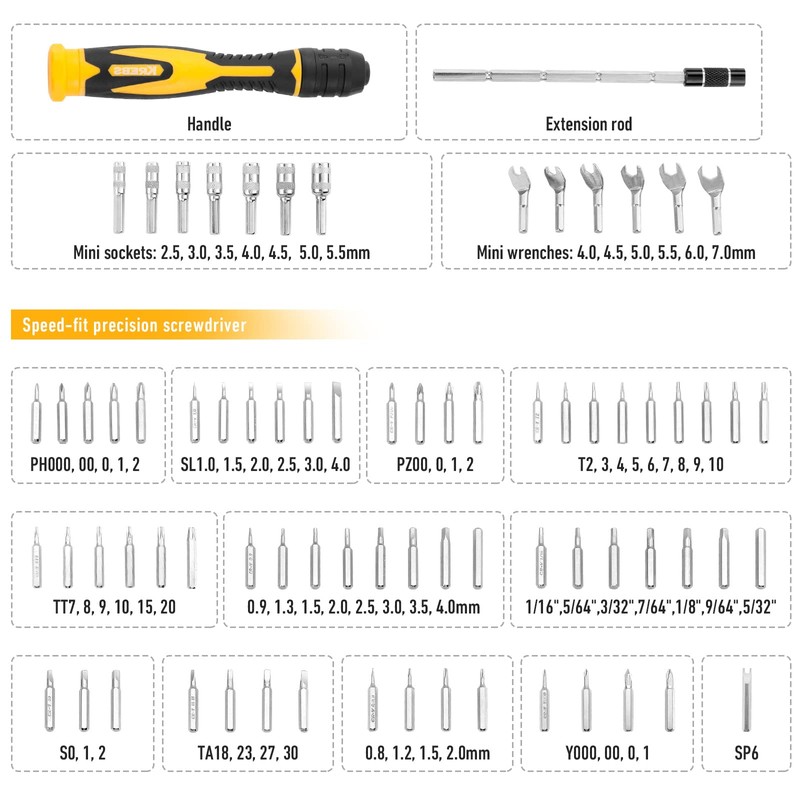 - [MULTIPLE USES]-Contains 7PC mini drive sockets, 61PC precision screwdriver bits, 1PC 1/4 inch drive none slip grip bit driver, 6PC mini wrenchs and 1 extenion holder