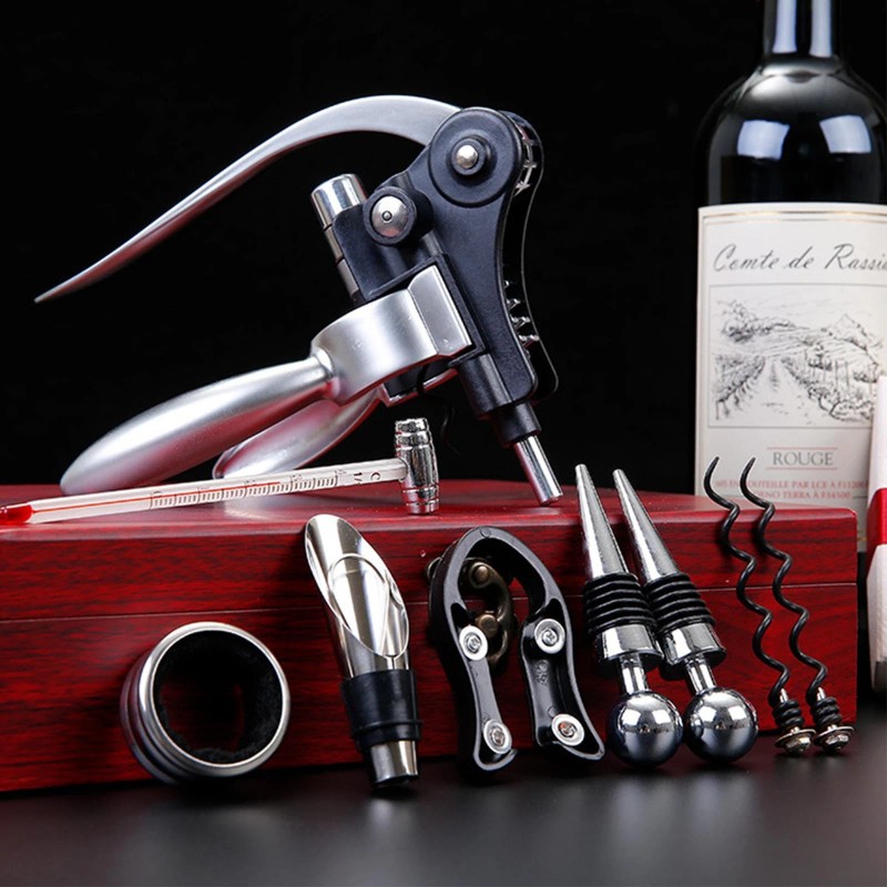 【Complete Wine Opener Set of 9】 This Corkscrew Wine Opener Set includes all the essential tools for a perfect wine experience, such as a Foil Cutter, Wine Pourer, Drip Ring, Vacuum Wine Stopper, Wine Stopper, Thermometer, and extra Corkscrews.