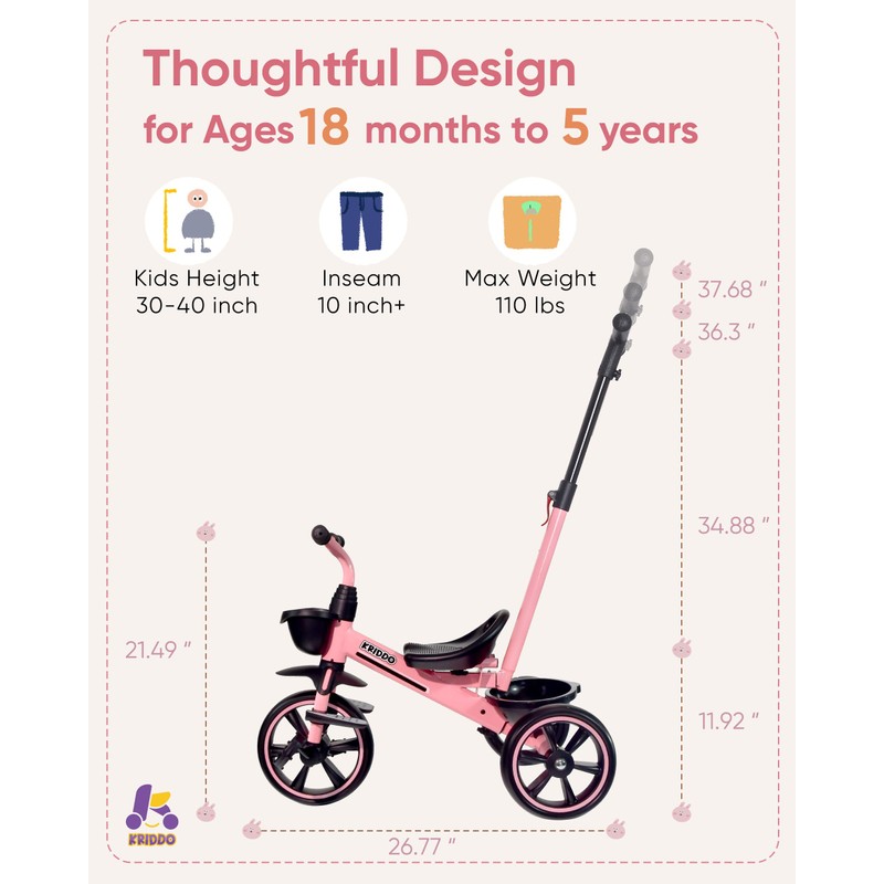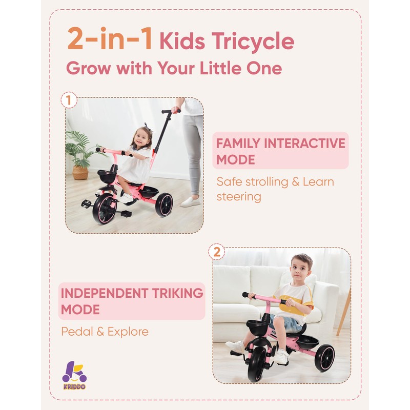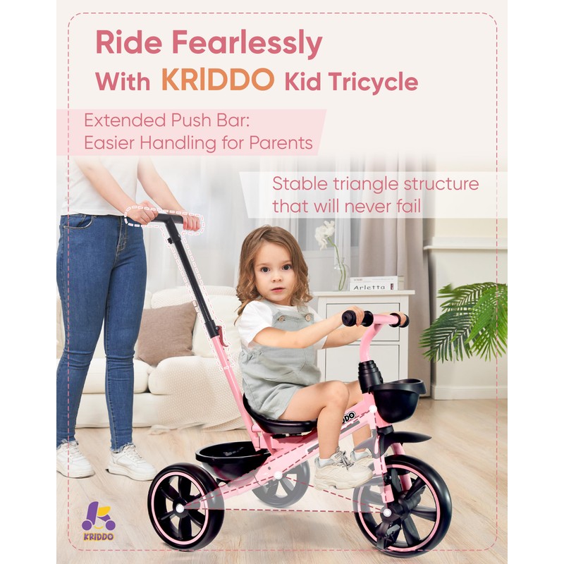 KRIDDO 2-in-1 Toddler Tricycle for Ages 18 Months to 5 Years Old - Extended Push Handle for Effortless Push, Gift Trike for Toddler 3 to 5 Year, Kids Tricycle with Foldable Front Footrest, Pink