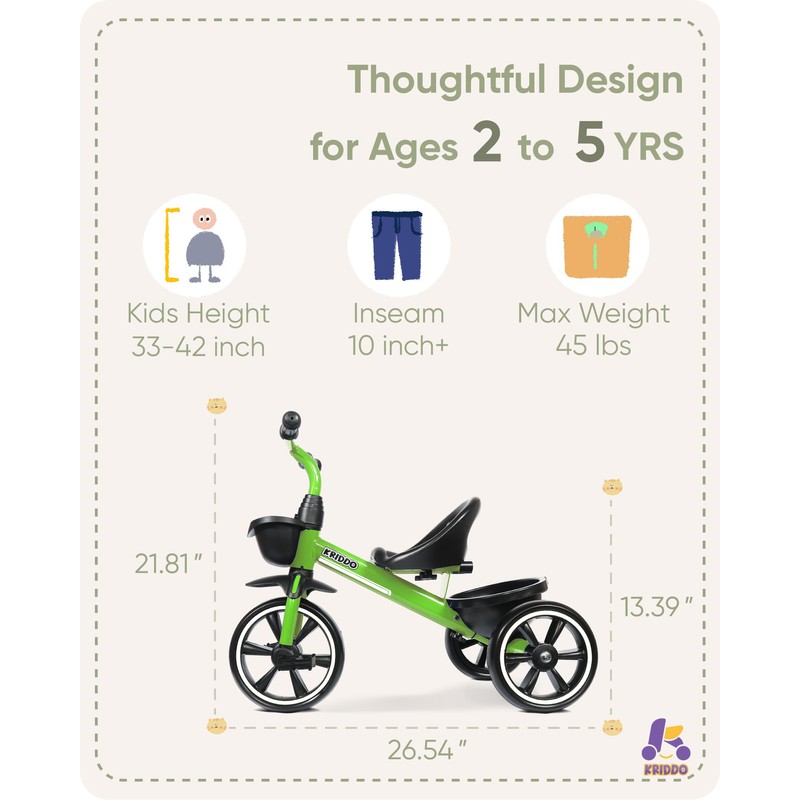 KRIDDO Tricycles Age 24 Month to 4 Years, Toddler Kids Trike for 2.5 to 5 Year Old, Gift for 2-4 Year Olds , Green