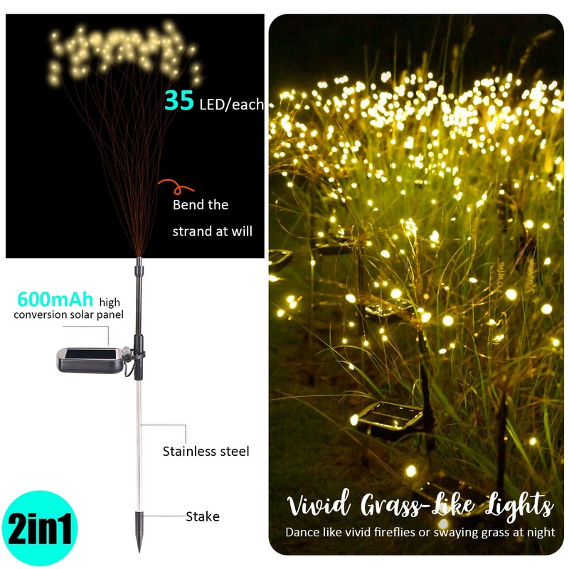 - Solar Firefly Lights: Include 2 pack solar firefly Lights(35 LED/p, 70 LED total). 2x stake. Lights Color: warm white. Mode: flicker on. Solar Panel: 3.7V/600mAh. Charging Time: 6 hours. Working Time: 6-8 hours. The firefly lights will dance like vivid fireflies or swaying grass at night, and the strands are almost invisible in the grass during the day. HOW TO USE: turn over the panel and push to “ON” before first use. Make sure the panel south-facing to direct sunlight for charging.