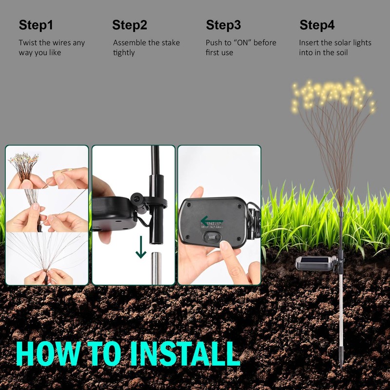 - Auto On/Off: The solar firefly Lights glows at night and charges in the day automatically. Insert the stake insert in the soil anywhere. Ideal ambient lights to brighten garden path, porch, patio, front door or entryway. Used as solar path lights, hang on Christmas trees branches, fences, pergola or roof to offer illumination.