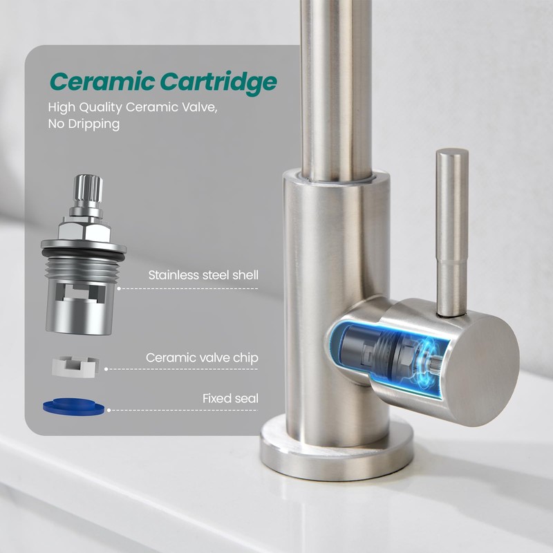 - HIGH-STRENGTH STAINLESS STEEL MATERIAL: The single handle kitchen faucet is made of solid stainless steel, with good corrosion resistant performance for ensuring the quality and longevity, Superior cartridge provide smooth water flow and reduce leakage probability