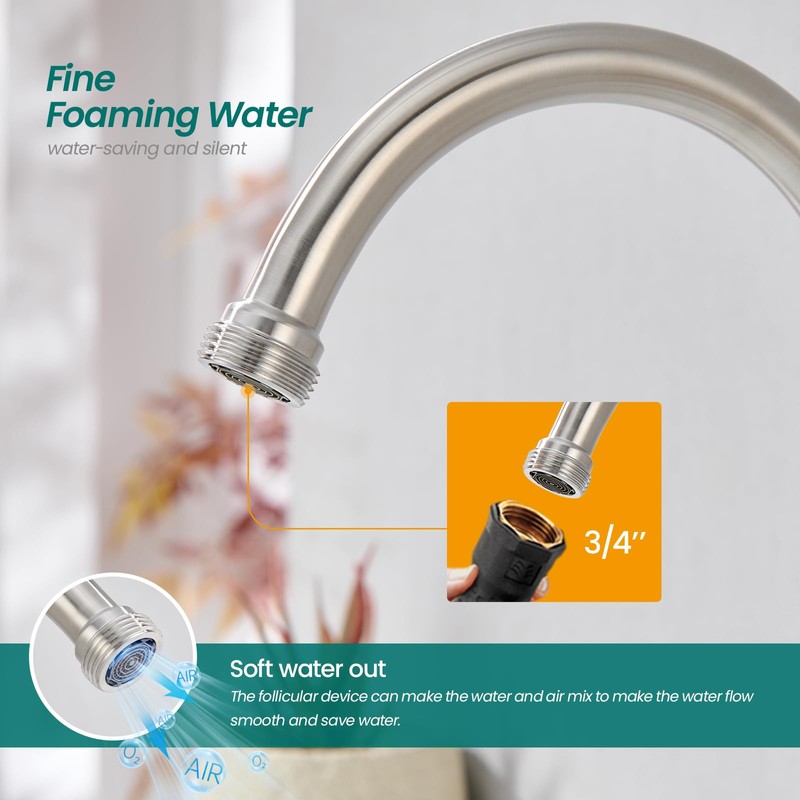- 5.9 INCH 360 DEGREE SWIVEL SPOUT with GARDEN HOSE END : Utility sink faucet spout can be rotated 360 degrees, it allows the water reaches every corner of the kitchen sink as possible, suitable for sinks with compartments, spout is equipped with a bubbler, the water is soft, does not splash, 3/4’’ GHT garden hose thread lets you connect a garden hose for multiple washing needs